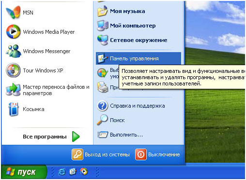 У лівій нижній панелі знайдіть значок «Пуск», натисніть на нього лівою кнопкою мишки, після чого в меню що розкрилося оберіть пункт «Панель керування», або «Пуск» -> «Налаштування» -> «Панель керування»: