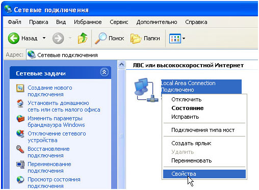 У вікні «Мережеві підключення» знайдіть значок «Підключення по локальній мережі» і натисніть на ньому правою кнопкою миші. В меню, що відкрилося оберіть пункт «Властивості»: