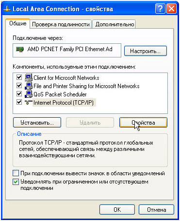 Ви повинні побачити вікно «Підключення по локальній мережі - властивості». У списку «Компоненти, що використовуються цим підключенням:» оберіть «Internet Protocol (TCP/IP)», або «Протокол Інтернету (TCP/IP)» та натисніть кнопку «Властивості»: